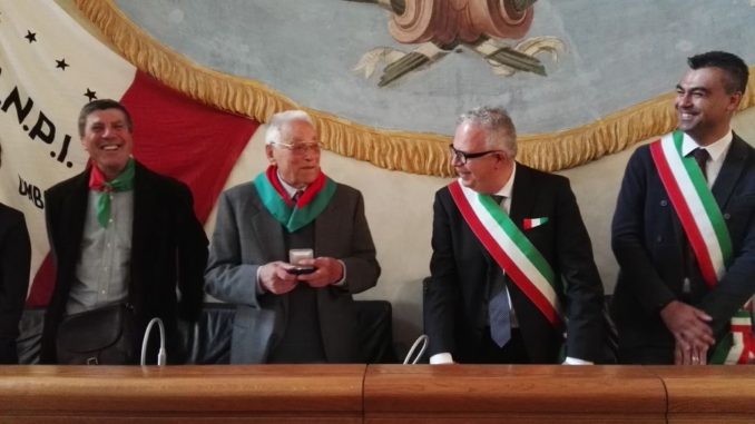 E’ stata consegnata questa mattina, in occasione del 2 Giugno, Festa della Repubblica, la medaglia della Liberazione al partigiano della 1° Brigata proletaria d’urto San Faustino Domenico Bruschi. 91 anni compiuti, nato a Montone ma residente ad Umbertide, Bruschi, tra gli ultimi partigiani altotiberini in vita, è stato insignito del prestigioso riconoscimento dal Ministero della Difesa in occasione del 70esimo anniversario della lotta di Liberazione e questa mattina nella Sala consiglio della Residenza comunale ha ricevuto dalle mani del sindaco di Umbertide Marco Locchi la medaglia firmata dal ministro della difesa Pinotti. Erano presenti anche gli assessori del Comune di Umbertide Pier Giacomo Tosti e Cinzia Montanucci, il sindaco di Montone Mirco Rinaldi, accompagnato dagli assessori Roberto Persico e Roberta Rosini, e Daniele Carini dell’Anpi di Montone, di cui Bruschi è presidente.