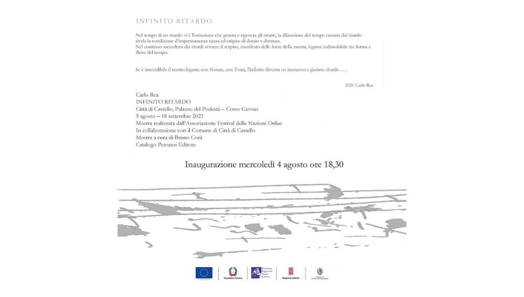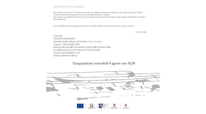 Infinito ritardo è il titolo della mostra di Carlo Rea, creata e allestita nell’ambito del 54° Festival delle Nazioni dedicato alla Norvegia. L’esposizione del pittore, scultore e musicista, curata da Bruno Corà, inaugurerà mercoledì 4 agosto 2021 alle ore 18.30 nei locali di Palazzo del Podestà di Città di Castello (corso Cavour) e resterà aperta al pubblico per tutta la durata della manifestazione, fino al 21 settembre 2021.