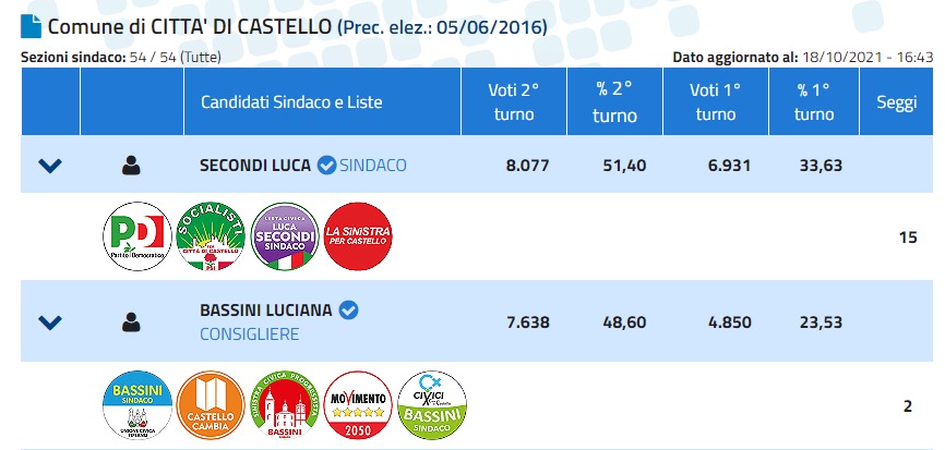 Si sono concluse le operazioni di voto a Città di Castello. Luca Secondi è il nuovo sindaco di Città di Castello con il 51,40% pari a 8.077 voti. Luciana Bassini ottiene il 48,60% dei voti pari a 7638 voti. Si sono concluse le operazioni di voto a Città di Castello. L’affluenza definitiva del turno di ballottaggio è del 51,19% pari a 16.354 elettori.