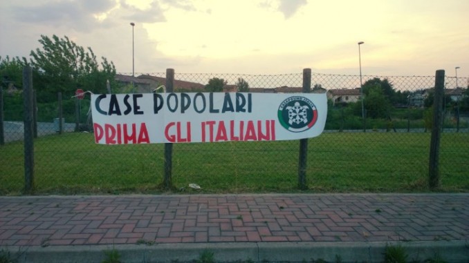Città di Castello, 11 giu – Dopo l’uscita della graduatoria di assegnazione delle case popolari a Citta’ di Castello Casapound affigge uno striscione in citta’ dal testo chiaro “Case popolari, prima gli italiani!” e rilancia con forza la raccolta firme per modificare la legge regionale di assegnazione delle stesse.