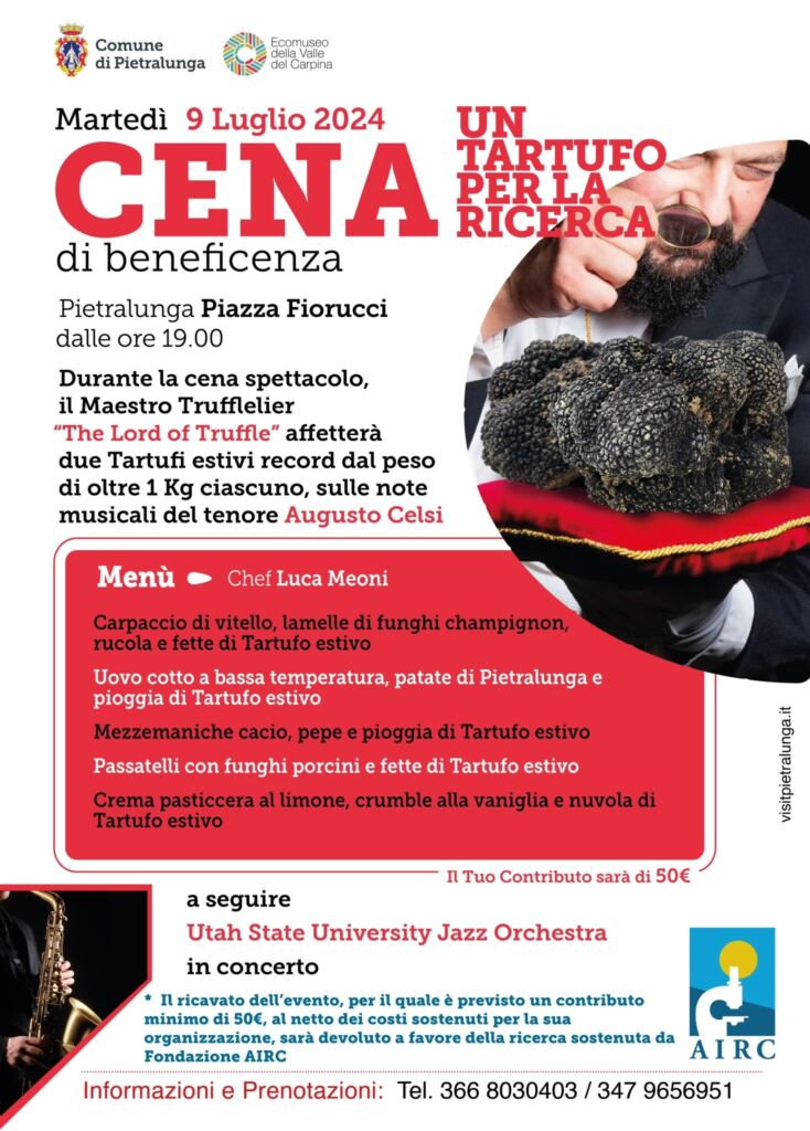 La cena sarà un’occasione per gustare questi tartufi estivi, ognuno dei quali pesa oltre un chilogrammo. Daniele Violoni, noto come The Lord of Truffle, affetterà i tartufi durante la cena, accompagnato dalle note musicali del tenore Augusto Celsi.