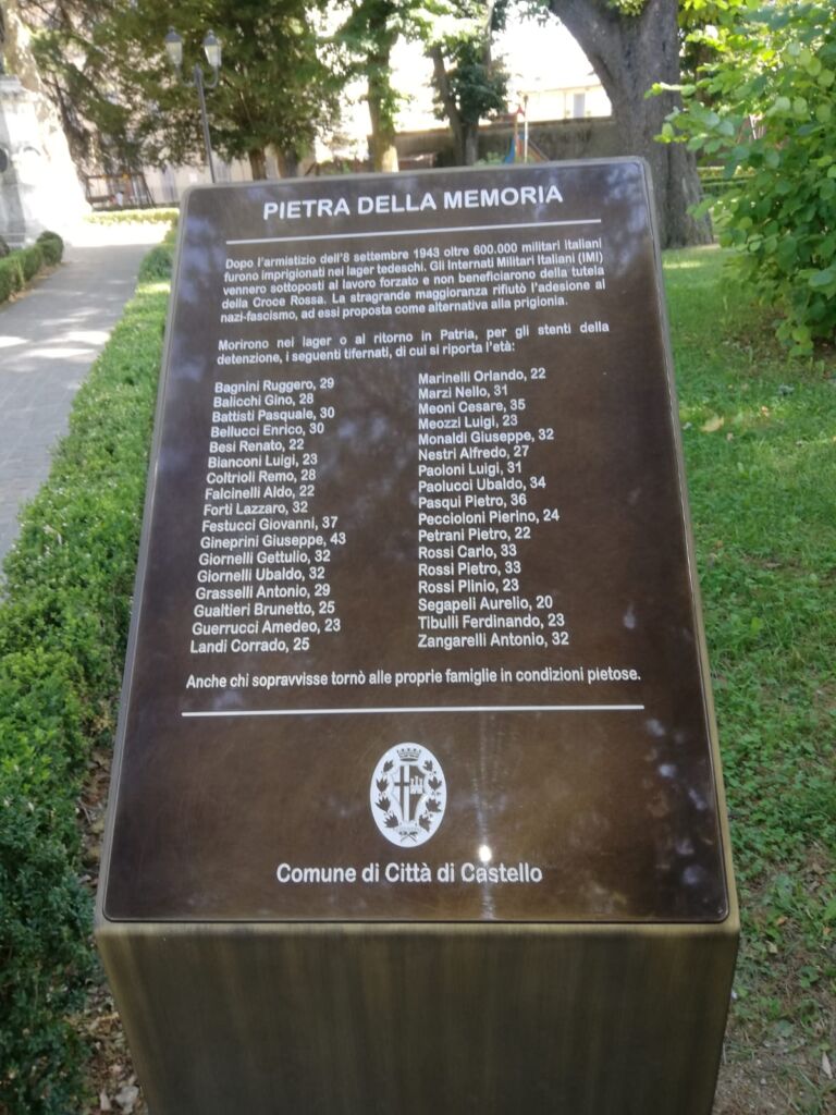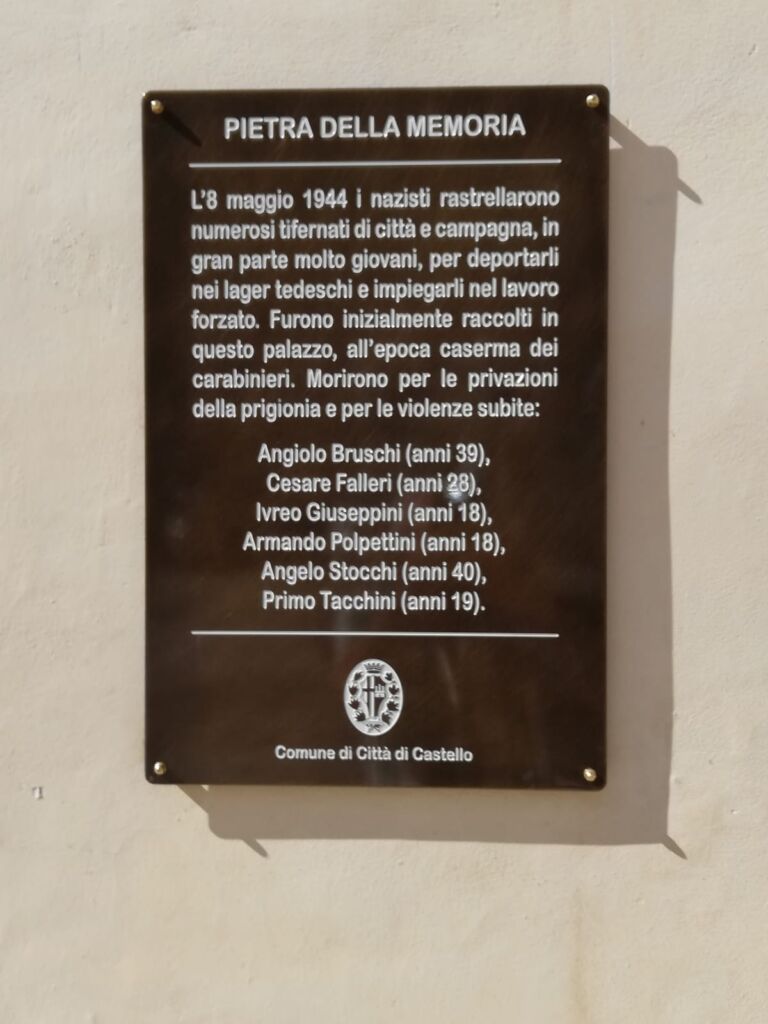 Le pietra della memoria collocata ai giardini del Cassero insieme alla targa commemorativa ricorderà d’ora in poi il sacrificio di 34 militari tifernati: Ruggero Bagnini; Gino Balicchi; Pasquale Battisti; Enrico Bellucci; Renato Besi; Luigi Bianconi; Remo Coltrioli; Aldo Falcinelli; Lazzaro Forti; Giovanni Festucci; Giuseppe Gineprini; Gettulio Giornelli; Ubaldo Giornelli; Antonio Grasselli; Brunetto Gualtieri; Amedeo Guerrucci; Corrado Landi; Orlando Marinelli; Nello Marzi; Cesare Meoni; Luigi Meozzi; Giuseppe Monaldi; Alfredo Nestri; Luigi Paoloni; Ubaldo Paolucci; Pietro Pasqui; Pierino Peccioloni; Pietro Petrani; Carlo Rossi; Pietro Rossi; Plinio Rossi; Aurelio Segapeli; Ferdinando Tibulli; Antonio Zangarelli.