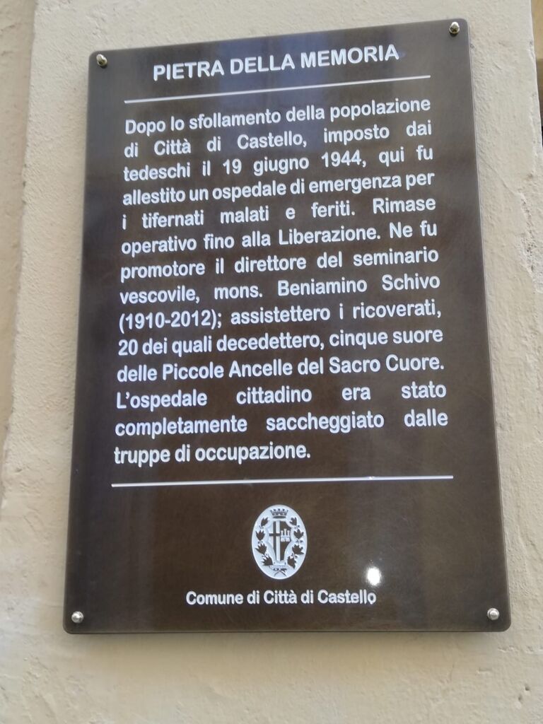 Presso l’ingresso della Biblioteca comunale Carducci, in piazza del Marchese Paolo, saranno commemorati sei civili: Angiolo Bruschi, Cesare Falleri; Ivreo Giuseppini; Armando Polpettini; Angelo Stocchi; Primo Tacchini. Al69l’oratorio don Bosco in via san Girolamo sarà invece ricordata l’esperienza dell’ospedale di emergenza allestito nel 1944 dopo lo sfollamento della popolazione di Città di Castello imposto dai militari tedeschi, che rimase operativo fino alla liberazione della città. Con essa sarà messa in rilievo la figura di monsignor Beniamino Schivo, che da direttore del seminario vescovile fu promotore dell’allestime