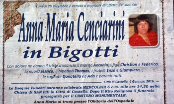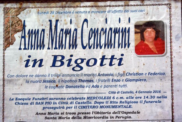 Mercoledì ultimo saluto ad Anna Maria Cenciarini, la donna di 55 anni uccisa a coltellate nella sua casa di Varesina, a Città di Castello. I funerali nella chiesa di San Pio X. A celebrare la messa il vescovo Domenico Cancian, insieme al parroco di San Pio X don Biondini e ai frati cappuccini del santuario di Belvedere, padre Rosati e padre Biscarini. Per il suo omicidio è stato arrestato il figlio Federico.