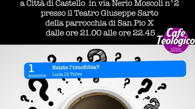 CITTA’ DI CASTELLO – Lunedì 1 Dicembre ore 21 il consueto appuntamento con il Café Teologico di Città di Castello. Stavolta il tema che animerà la serata al Teatro Giuseppe Sarto di San Pio X sarà uno dei più attuali e scottanti: “Esiste l’omofobia?”. A parlarne in prima persona Luca Di Tolve, protagonista del famoso testo del cantante Povia che ne ha resa pubblica la storia. Un sentiero di sofferenza alla ricerca di sé stesso e di un qualcosa di ancora più grande. Un cammino spirituale di conoscenza, redenzione e di rinascita a nuova vita.