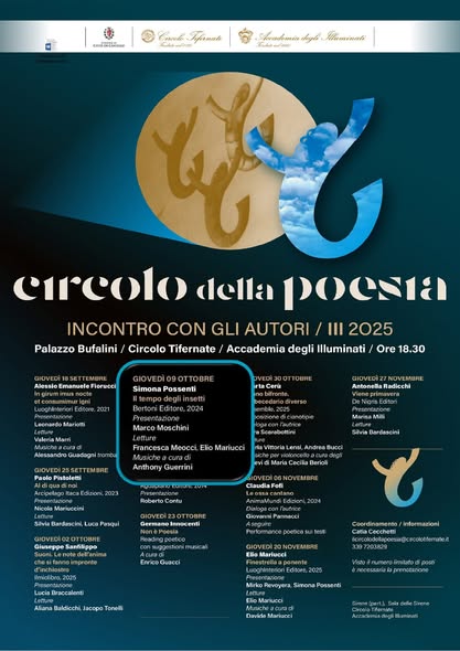 L’intensa settimana inizia giovedì 9 ottobre con il Circolo della Poesia, che alle 18:30 al Circolo Tifernate Accademia degli Illuminati di Palazzo Bufalini ospiterà Simona Possemti. La presentazione sarà affidata a Marco Moschini, con letture coinvolgenti di Francesca Meocci e Elio Mariucci, sostenute dalle note di chitarra di Nico Pruscini, per una serata dove parola e musica si fonderanno armoniosamente.