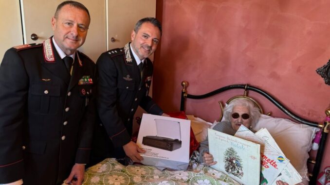 Nonostante l’età la “nonnina” tifernate ha molto apprezzato la visita dei militari dell’Arma, rappresentata dal comandante della Compagnia, Capitano Massimiliano Croce, e dal comandante di Stazione, il Luogotenente Fabrizio Capalti. Una volta all’interno nell’accogliente abitazione i Carabinieri hanno voluto allietare il momento attraverso un particolare gesto di solidarietà, omaggiando la cara signora di un giradischi, nuovo ma in stile vintage, e tre dischi vinili contenenti canti di natale e musica della tradizione classica italiana degli anni ’50 e ’60, fra cui una memorabile edizione rivisitata di “Parlami d’amore Mariù” di Achille Togliani.