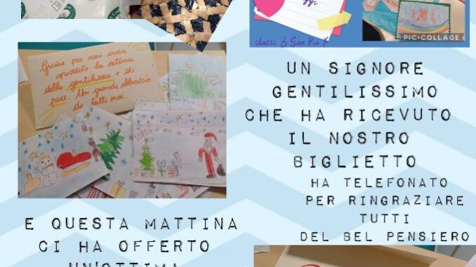 Un signore del quartiere, che ha ricevuto un biglietto, ha chiamato a scuola cercando le maestre di una classe per ringraziare del bellissimo regalo e poiché (testuali parole) la catena della gentilezza non va spezzata, ha deciso di offrire la colazione alle classi autrici del suo biglietto. Le più sorprese le docenti che non speravano in una così calorosa accoglienza per il semplice gesto dei loro alunni. La meraviglia per il pensiero, per la colazione e perché, anche se la quotidianità mostra altro, le brutte cose impolverano solo il buono che ancora c’è ovunque.