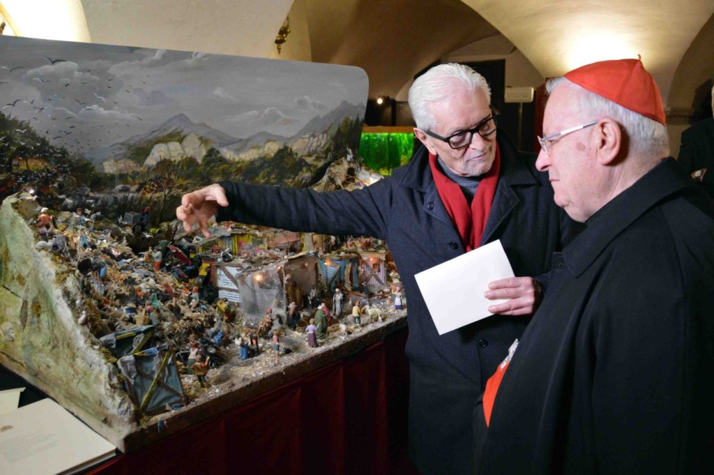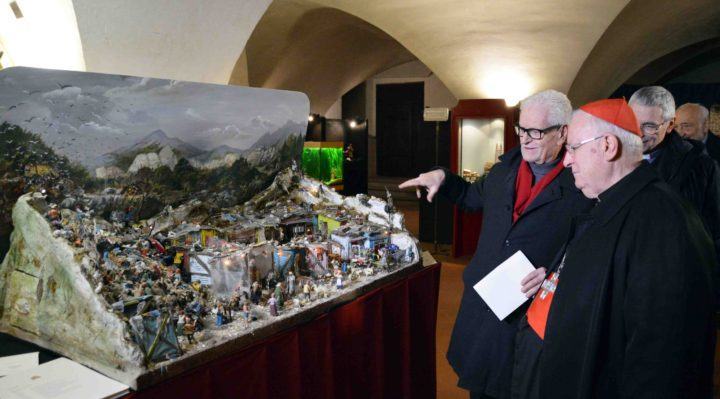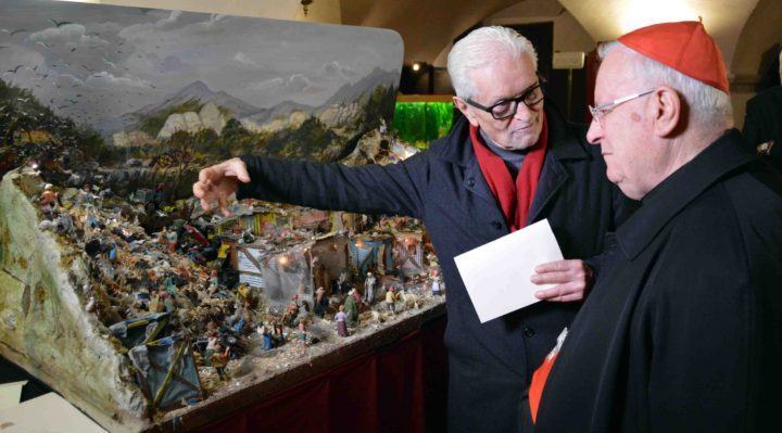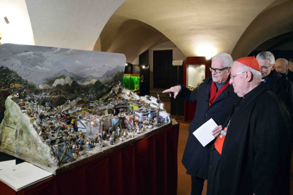 “Plaudo a questa iniziativa che si ripete ormai da anni, sempre con arricchimenti ulteriori e allusioni suggestive e significative ai temi più attuali. Quest’anno si pone anche l’accento sul tema delle discariche, sia come riferimento concreto, sia come valore simbolico, metafora di quelle periferie umane su cui Papa Francesco non si stanca di mettere l’accento”, e’ quanto dichiarato dal Cardinale, Gualtiero Bassetti, nel corso della visita ai presepi esposti nella cattedrale ed in particolare soffermandosi accanto al grande presepe napoletano di 12 metri per 2 opera del maestro, Paolo Durante, lo stesso che lo scorso anno realizzò il presepe degli sbarchi dei migranti a Lampedusa.
