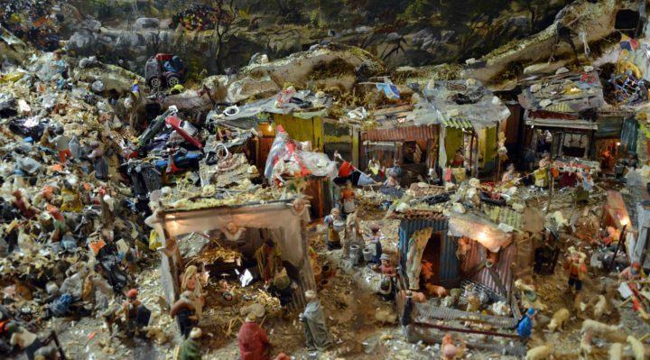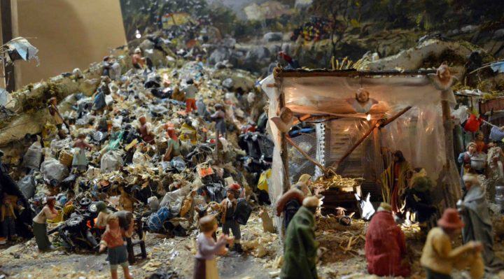 Gli dona la sua merendina trovata nella discarica.”, è quanto scrive Durante, con una toccante poesia allegata al presepe “metropolitano” che può candidarsi a pieno titolo a rappresentare attraverso la natività e l’arte che la raffigura il momento attuale che la società contemporanea sta attraversando. “Un accento e un’attenzione più che mai urgente verso la nostra comune umanità e verso la nostra vita – ha proseguito Bassetti – in questo pianeta, amato e sofferente, alla cui salute ognuno di noi è chiamato a contribuire con i propri comportamenti. Questa mostra, un presepe di presepi, da visitare uno ad uno e coralmente, sia come singoli oggetti d’arte sia nella loro narrazione complessiva, rappresenta benissimo l’importanza di aver cura dell’immenso presepe che è la terra, dove ogni istante si consumano delitti e ingiustizie, ma ad ogni angolo, anche in mezzo al mare, anche nei barconi dei derelitti, si assiste al miracolo della nascita di bambini e al rifiorire di segni di speranza, di impegno e di vitalità.