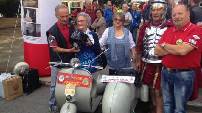 CITTA’ DI CASTELLO – “Andare piano in Vespa ti allunga la vita: basta però indossare sempre il casco, rispettare i limiti di velocità e la segnaletica stradale”. Parola di Nonna Luisa, mascotte dei vespisti d’Italia, 105 anni ben portati. Un vero e proprio fuori programma con tanto di inedito spot alla sicurezza stradale, in particolare rivolto ai giovani, quello che è andato in scena questa mattina (ndr domenica 16 luglio) nella suggestiva Piazza Garibaldi, in occasione del Raduno nazionale dei Vespa Club promosso dal sodalizio di appassionati tifernate con il titolo “In vespa nella Città del Rinascimento”, che ha registrato la presenza di centinaia di equipaggi (oltre 400 persone) provenienti da tutta la Penisola e oltr’Alpe anche dal Belgio e dalla Germania. La nonna “volante”, Luisa Zappitelli, 105 anni (nata a Città di Castello, precisamente alla Villa del Seminario l’8 novembre del 1911 sempre al voto dal dopoguerra ad oggi) ha tenuto a battesimo l’invasione pacifica nel centro di Città di Castello degli appassionati delle due ruote Piaggio. Appena scesa dall’auto l’arzilla “vespista”, accompagnata dai figli Anna e Dario Ercolani, ha posato per le tradizionali foto di rito accanto al presidente del Vespa Club di Città di Castello, Lazzaro Gaudenzi Fiorucci prima di dare il via alla manifestazione ed al tour turistico in altotevere.