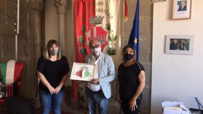 Il sindaco di Città di Castello Luciano Bacchetta ha ricevuto presso la residenza municipale una delegazione delle socie lavoratrici del laboratorio Tela Umbra ( sono sei più il Presidente il Professor Pasquale La Gala) per porgere loro i più sentiti ringraziamenti di tutta la comunità locale per le pregevoli realizzazioni, un tricolore in Lino e mascherine che sono state donate al Presidente della Repubblica Mattarella nel corso dello “storico” incontro che si e’ svolto al Quirinale, venerdì 19 Giugno.