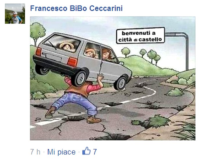 Le foto danno un’idea più esplicativa di tante parole! C’è l’allarme lanciato nel web per chi percorre alcune strade di Città di Castello. Sul suo profilo di Facebook Luigino Pasqui scrive: “Dichiaro ufficialmente riaperte le nostre carissime (in tutti i sensi) buche de castello! Ruote, tremate, le buche son tornate!”. E ne ha ben donde a guardar le immagini. A lui una eco lunga tra l’incazzato e il rassegnato/ironico. Ma, prima di tutto un altro suo aggiornamento: “…se venite da castello direzione Arezzo attenzione: dopo 50 Mt dall’inizio del ponte c’è una buca scassa sospensioni! Quella segnalata qualche mese fa”. E poi gli altri commenti, ma anche qualche simpatica e ironica vignetta che vi riproponiamo. Ma è mai possibile, aggiungiamo noi, vedere questo scempio? Vergogna!!!!!!