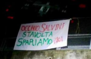 Dal Folignate all’Alta valle del Tevere, accolto con un benvenuto pieno di entusiasmo, ma anche con uno striscione dai toni minacciosi ed espliciti, appeso sul cavalcavia tra Umbertide e Gubbio, “Occhio Salvini, stavolta spariamo noi”, con tanto di cappio vicino, messo intorno alla mezzanotte e subito rimosso dai carabinieri.