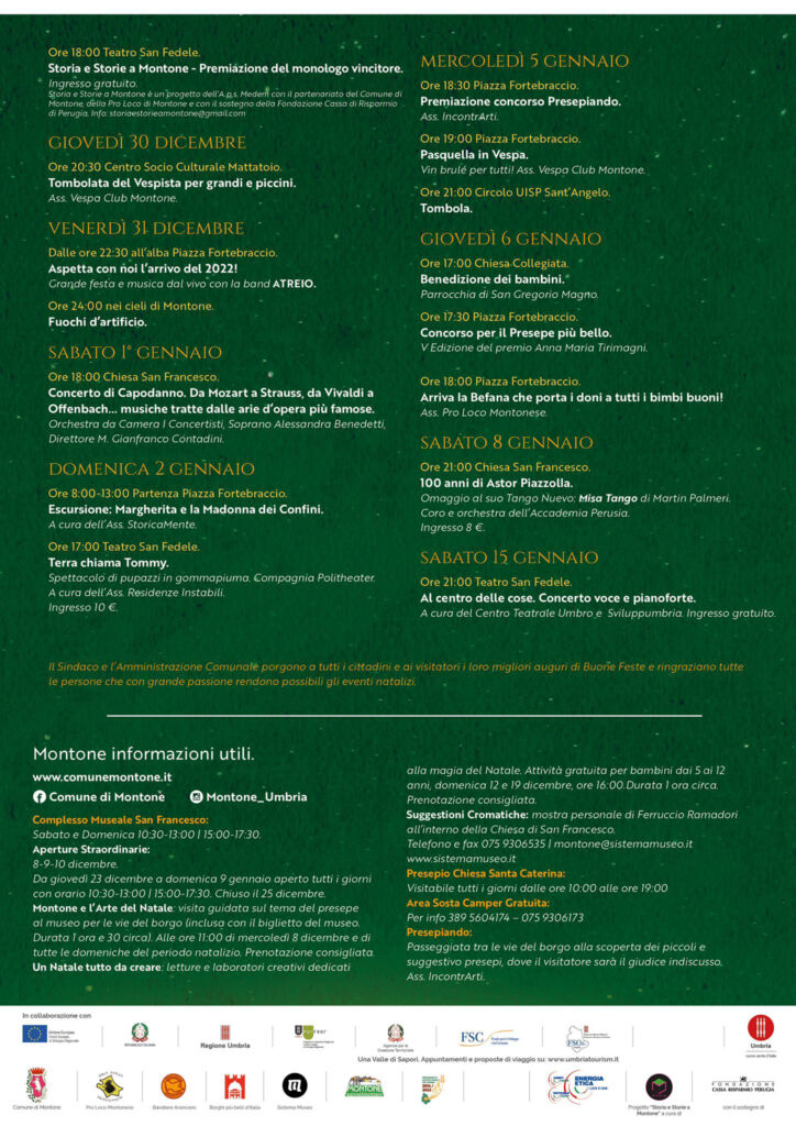 Tra gli eventi di spicco anche quello di giovedì 23 dicembre dal titolo “Natale sotto l’albero”, un momento dedicato ai più piccoli che riceveranno i doni da Babbo Natale e le sue renne, il tutto contornato dall’allegria della Filarmonica Braccio Fortebraccio e dal vin brulé. Da segnalare poi l’apertura del presepe a partire dal 24 dicembre e il tradizionale “Concerto di Natale” nella chiesa Collegiata il 26 dicembre, a cura della Corale Fortebraccio di Montone. Tra gli appuntamenti anche il Capodanno in piazza, venerdì 31 dicembre, con musica dal vivo della band ATREIO e i fuochi d’artificio.