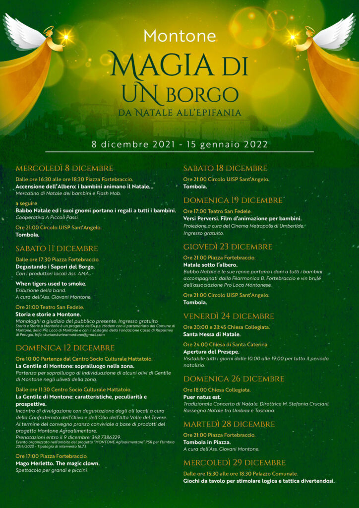 Da non perdere l’appuntamento con la Gentile di Montone previsto nella mattinata di domenica 12 dicembre, con un sopralluogo della zona e un incontro di divulgazione arricchito da una piacevole degustazione degli oli locali, a cura della Confraternita dell’Olivo e dell’Olio dell’Alta Valle del Tevere. Nel pomeriggio, alle ore 17, in Piazza Fortebraccio si terrà lo spettacolo per grandi e piccini “Mago Merletto. The magic clown”.