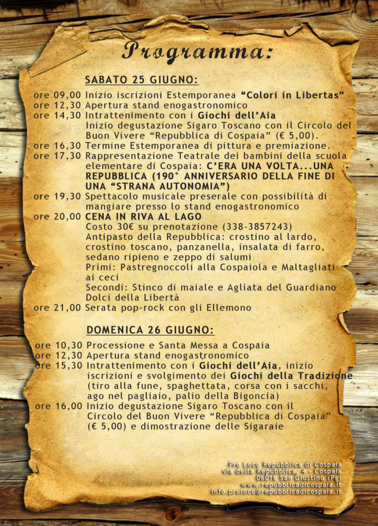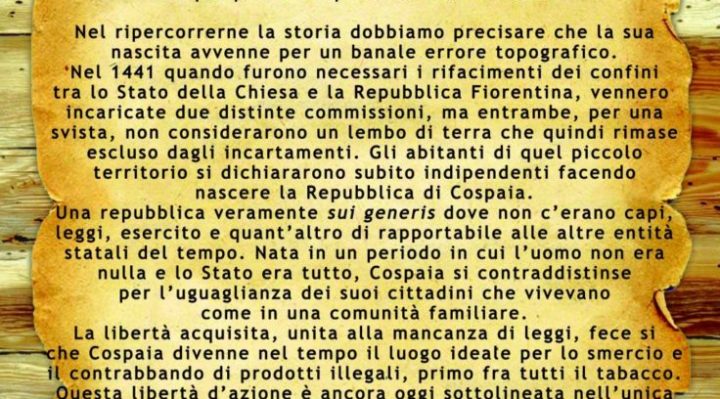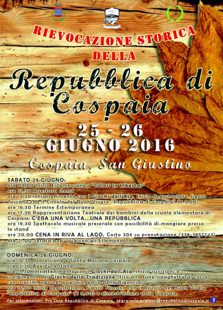 Il punto di partenza è ovviamente la rievocazione della eccentrica storia di questa singolare Repubblica con una gestazione e un trascorso unico al mondo che ci piacerebbe raccontare a tutti quelli che avranno il desiderio di visitarci nei due giorni di giugno del 25 e del 26 , tra colori ,paesaggi , ricordi ,spettacoli popolari giochi e musica …e con ospite il tabacco e il suo contrabbando di allora ,i suoi derivati e ovviamente il giusto corollario della buona enogastronomia .