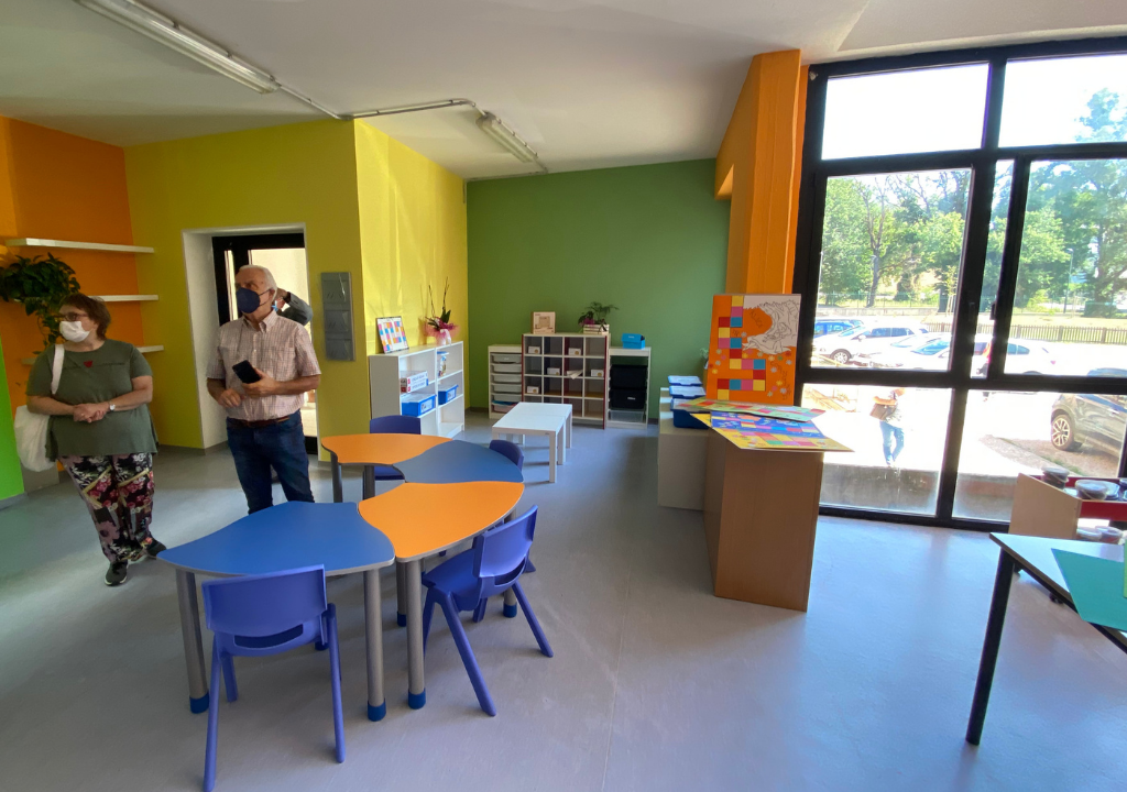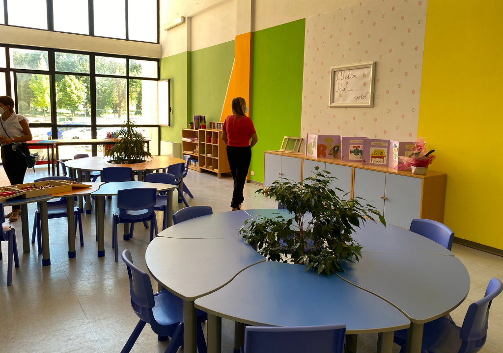 L’idea era quella di sfruttare l’ampio spazio dell’ex aula mensa, valorizzandolo ma soprattutto conferendogli un aspetto innovativo e stimolante, adatto ad accogliere le idee e a fornire ai bambini gli strumenti necessari per le loro creazioni.