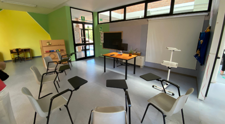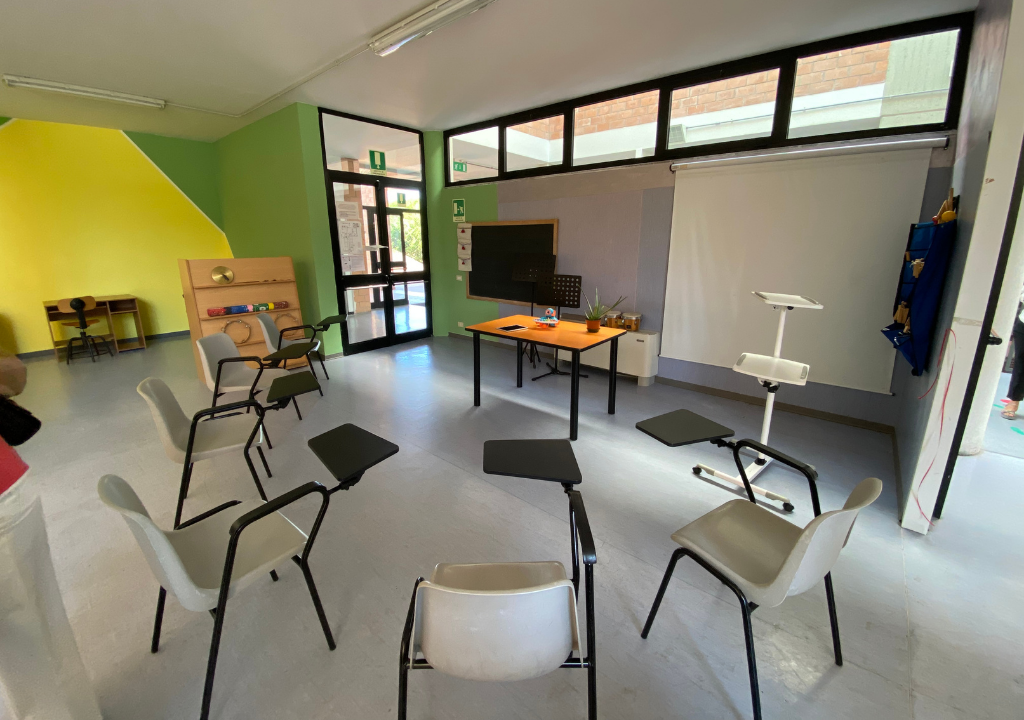 L’interno è stato quindi suddiviso in cinque aree: una zona legata ad attività che vanno dal tinkering, al making e al coding, in cui è possibile la progettazione con l’uso di strumenti digitali; l’angolo della creatività che si richiama al principio di Bruno Munari; l’area del “fare” dove i bambini hanno a disposizione diversi attrezzi, come quelli da falegname, per creare oggetti con materiali di recupero ma dove possono anche realizzare libri fatti a mano; una parte dedicata alla robotica e al digitale dove possono elaborare i propri progetti attraverso l’uso di queste tecnologie e dove è stata collocata una stampante 3D; e infine uno spazio musicale con una lavagna a pentagramma, un proiettore interattivo e oggetti musicali creati dagli stessi alunni nel corso degli anni.