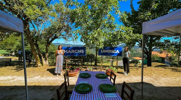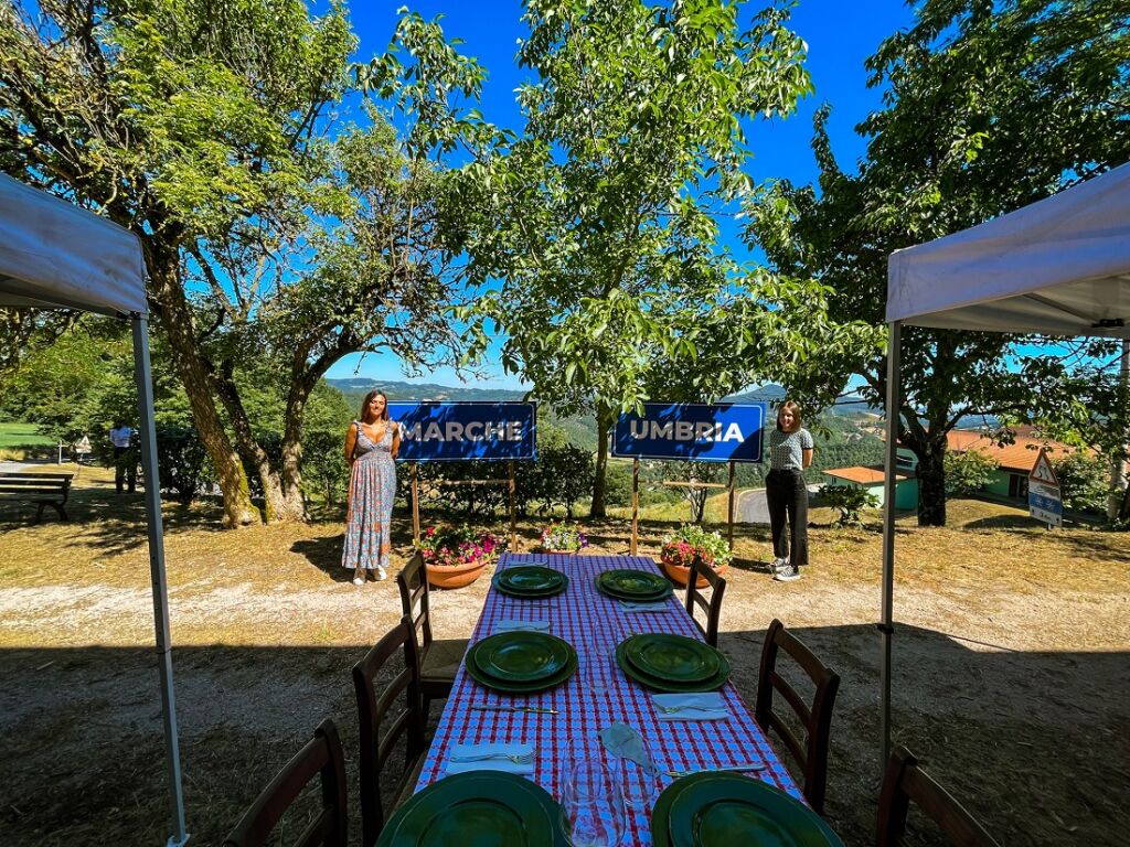 Su iniziativa dei sindaci di Apecchio e di Pietralunga, in località Pian della Serra, un suggestivo borgo arroccato sul crinale del confine umbro-marchigiano, a cavallo tra i due municipi, la tavola dell’inedito pranzo del periodo ferragostano è stato collocato esattamente sulla linea evidenziata nelle mappe catastali, che demarca i due territori di regioni diverse, nel giardino che si affaccia sulla proprietà di Giuseppe Collesi, imprenditore e titolare di un noto birrificio che sorge proprio lì accanto.