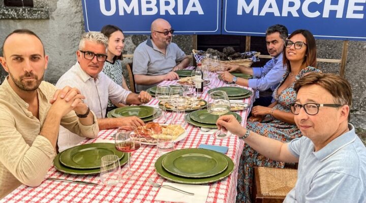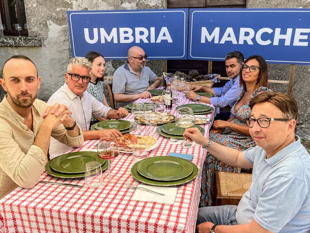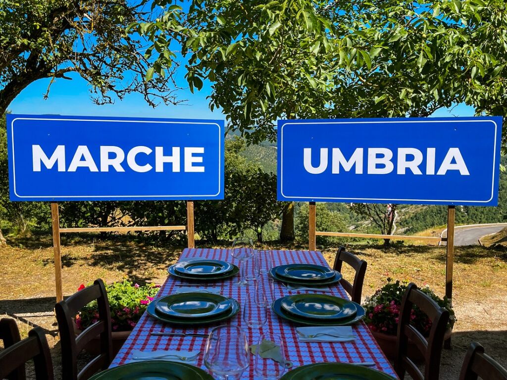 Gli otto commensali, seduti rigorosamente nella parte di tavola segnata dal cartello di provenienza della propria regione, come al confine della strada sottostante, hanno gustato a ritmo di musica della migliore tradizione contadina, brani davvero irresistibili (tarantella marchigiana e Scatola magica) eseguiti al clarinetto dal maestro Fabio Battistelli, umbro originario di Città di Castello, e dal marchigiano Christian Riganelli alla fisarmonica, originario di Recanati. Il giovane chef apecchiese Alessandro Valentini assieme alle sapienti cuoche del versante umbro, Tea e Romina Conti, del celebre ristorante di Castelfguelfo, hanno servito a tavola piatti della tradizione umbro-marchigiana con il profumato e prelibato tartufo nero estivo protagonista assoluto.
