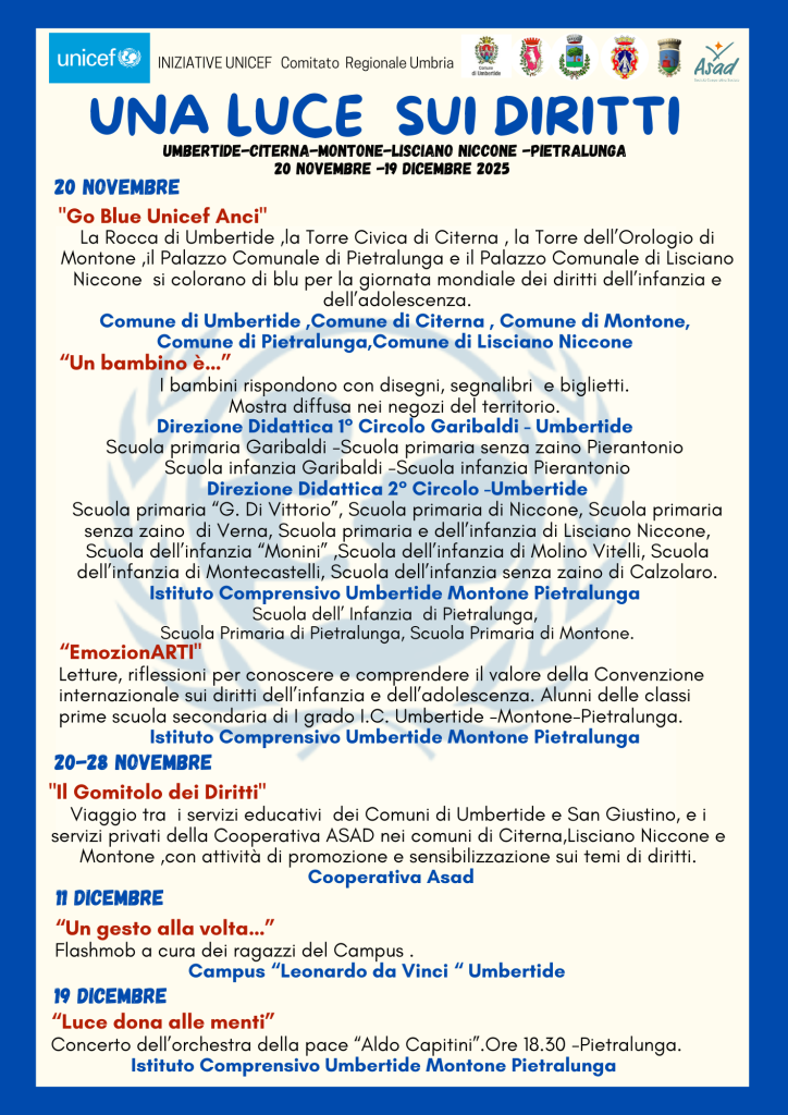 Il Comune di Umbertide ha sottolineato, con le parole del vicesindaco Annalisa Mierla e dell’assessore Lara Goracci, l’importanza di accendere una luce concreta contro discriminazioni e linguaggi d’odio. “La luce che illumina i diritti deve riflettersi sui volti reali dei bambini – hanno dichiarato – garantendo loro rispetto e serenità”.